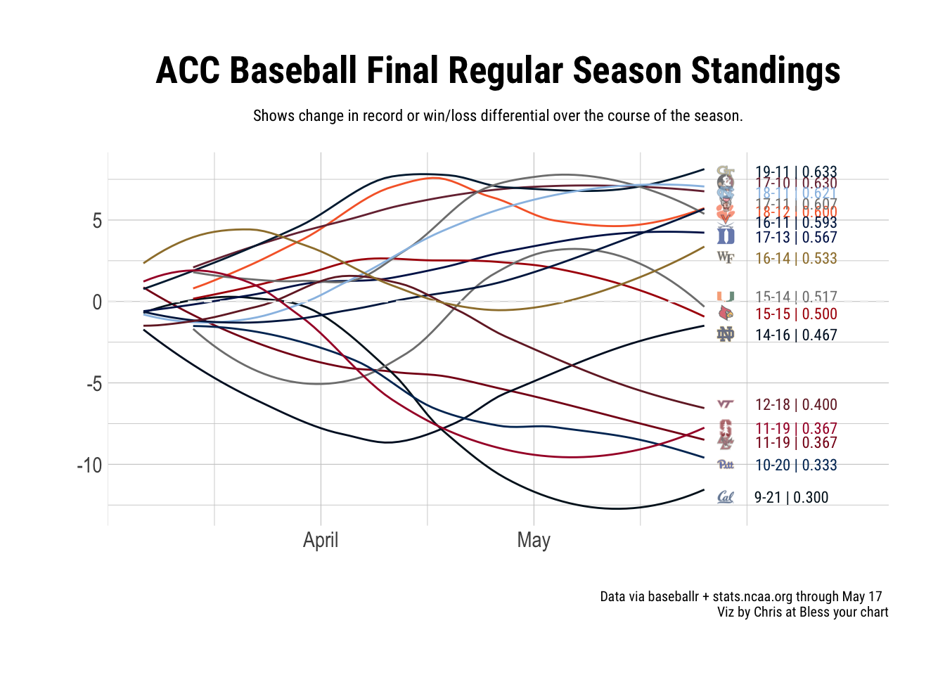 acc_plot_data <- acc_results_long |> dplyr::arrange(team, date) |> dplyr::mutate(win =as.integer(team_score > opp_score),loss =as.integer(team_score < opp_score) ) |> dplyr::group_by(team) |> dplyr::mutate(cum_win =cumsum(win),cum_loss =cumsum(loss),win_diff = cum_win - cum_loss,cum_games = cum_win + cum_loss,cum_win_pct = cum_win / cum_games ) |> dplyr::ungroup()target_date <-as.Date("2025-05-20")team_labels <- acc_plot_data |> dplyr::arrange(desc(date), -contest_id) |> dplyr::group_by(team) |> dplyr::slice_max(order_by = date, n =1) |> dplyr::left_join(standings, by =c("team")) |> dplyr::ungroup() |> dplyr::group_by(cum_win_pct) |> dplyr::mutate(stagger = dplyr::row_number() - (dplyr::n() +1) /2,y_staggered = win_diff + stagger *0.45 ) |> dplyr::ungroup() |> dplyr::mutate(y_staggered = dplyr::case_when( team =="Florida St."~ y_staggered +0.3, team =="North Carolina"~ y_staggered -0.3, team =="Clemson"~ y_staggered -0.45, team =="Virginia"~ y_staggered -0.1, team =="Wake Forest"~ y_staggered +0.7, team =="Miami (FL)"~ y_staggered -0.7, team =="Louisville"~ y_staggered -0.7, team =="Virginia Tech"~ y_staggered -0.3, team =="Boston College"~ y_staggered -0.4,TRUE~ y_staggered ) ) |> dplyr::distinct(team, .keep_all =TRUE)extension_date <-as.Date("2025-05-25")extend_rows <- acc_plot_data |> dplyr::group_by(team) |> dplyr::filter(date ==max(date)) |> dplyr::mutate(date = extension_date) |> dplyr::ungroup()acc_plot_data_extend <- dplyr::bind_rows(acc_plot_data, extend_rows)ggplot2::ggplot(acc_plot_data_extend, ggplot2::aes(x = date, y = win_diff, color = team)) + ggplot2::geom_smooth(linewidth =0.5, se =FALSE) + ggplot2::geom_text(data = team_labels, ggplot2::aes(x =as.Date("2025-05-31"), y = y_staggered, label = record_diff),hjust =-0.1,size =3,show.legend =FALSE,family ="Roboto Condensed" ) + ggplot2::scale_x_date(limits =c(as.Date("2025-03-07"), as.Date("2025-06-15")),breaks =as.Date(c("2025-04-01", "2025-05-01")),labels =function(x) format(x, "%B") # Full month name (e.g., "April") ) + ggplot2::expand_limits(x = target_date +5) + cbbplotR::scale_color_cbb_teams() + cbbplotR::geom_cbb_teams(data = team_labels, ggplot2::aes(x =as.Date("2025-05-28"), y = y_staggered, team = team),width =0.025,alpha =0.6, color =NA, ) + ggplot2::labs(title ="ACC Baseball Final Regular Season Standings",subtitle ="Shows change in record or win/loss differential over the course of the season.",x ="",y ="",caption ="Data via baseballr + stats.ncaa.org through May 17 \nViz by Chris at Bless your chart" ) + ggplot2::geom_hline(yintercept =0, linetype ="dashed", color ="#eeeeee") + hrbrthemes::theme_ipsum() + ggplot2::theme(plot.title = ggtext::element_markdown(hjust =0.5,size =20,family ="Roboto Condensed" ),plot.subtitle = ggtext::element_markdown(hjust =0.5,size =8.5,lineheight =1.5,family ="Roboto Condensed" ),legend.position ="none",#xis.text.x = ggplot2::element_blank(),axis.title.x = ggplot2::element_text(family ="Roboto Condensed"),axis.title.y = ggplot2::element_text(family ="Roboto Condensed"),plot.caption = ggplot2::element_text(face ="plain", size =7.5, "Roboto Condensed") ) -> acc_b_plotggplot2::ggsave("acc_b_plot.png", acc_b_plot,h =8,w =9.5,dpi =600,bg ="white",type ='cairo')acc_b_plot