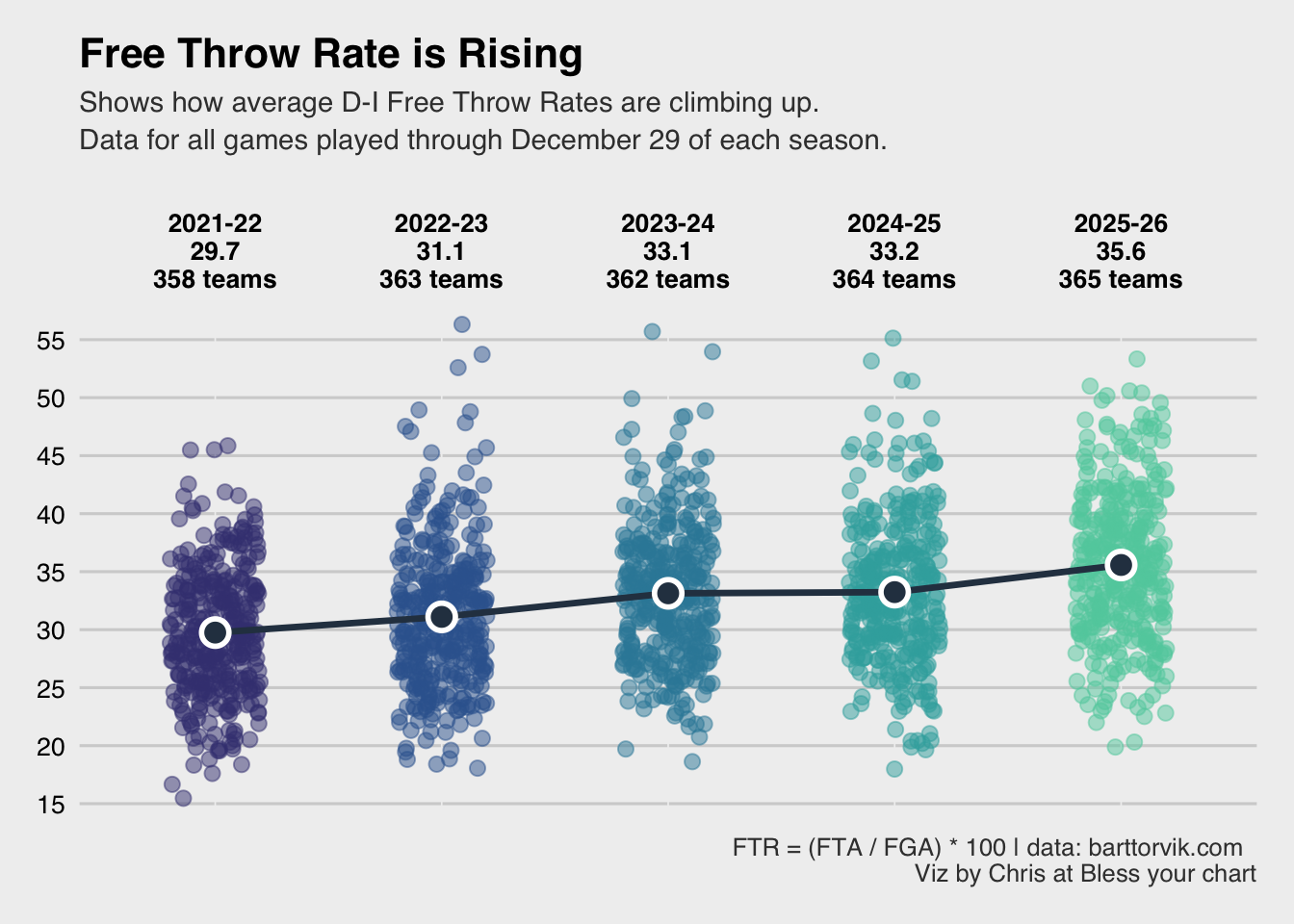 ftr_plot <- sum_tbl |> dplyr::mutate(year_label = dplyr::case_match( year,2022~"2021-22\n29.7\n358 teams",2023~"2022-23\n31.1\n363 teams",2024~"2023-24\n33.1\n362 teams",2025~"2024-25\n33.2\n364 teams",2026~"2025-26\n35.6\n365 teams" ) ) |> ggplot2::ggplot(ggplot2::aes(x =factor(year_label), y = ftr)) + ggplot2::geom_jitter( ggplot2::aes(color =factor(year)),width =0.2,alpha =0.5,size =2.5,show.legend =FALSE ) + ggplot2::stat_summary(fun = mean,geom ="line", ggplot2::aes(group =1),color ="#2c3e50",linewidth =1.2 ) + ggplot2::stat_summary(fun = mean,geom ="point",shape =21,fill ="#2c3e50",color ="white",size =4,stroke =1.5 ) + ggplot2::scale_color_viridis_d(option ="mako",begin =0.3,end =0.8) + ggplot2::scale_x_discrete(position ="top") + ggplot2::scale_y_continuous(breaks =seq(15, 55, 5)) + ggplot2::labs(title ="Free Throw Rate is Rising",subtitle ="Shows how average D-I Free Throw Rates are climbing up. \nData for all games played through December 29 of each season. \n",x ="",y ="FT Rate (FTR)",caption ="FTR = (FTA / FGA) * 100 | data: barttorvik.com \nViz by Chris at Bless your chart" ) + ggthemes::theme_fivethirtyeight() + ggplot2::theme(# text = ggplot2::element_text(family = "mono"),plot.title = ggplot2::element_text(color ="black",face ="bold",size =16 ),plot.subtitle = ggplot2::element_text(size =11, lineheight =1.1),axis.text.x.top = ggplot2::element_text(face ="bold",color ="black",size =10 ),axis.text.y = ggplot2::element_text(color ="black",size =10 ),legend.position ="none",panel.grid.major.x = ggplot2::element_line(color ="#f0f0f0", linewidth =0.3) )ggplot2::ggsave("ftr_plot.png", ftr_plot,w =6.5,h =7.5,dpi =600,type ="cairo")ftr_plot